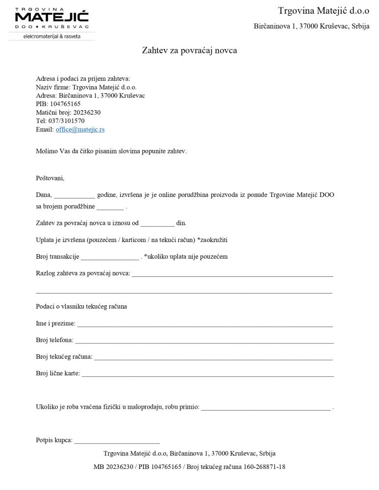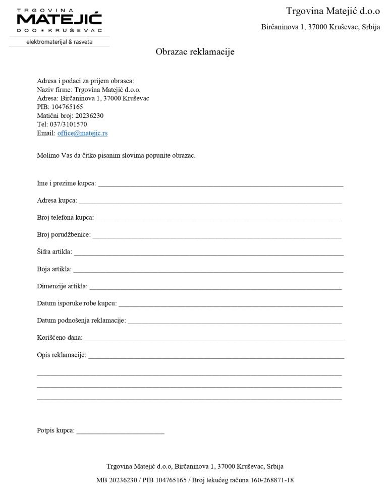 - Prodavac: TRGOVINA MATEJIĆ d.o.o., Birčaninova 1, 37000 Kruševac, Srbija, upisano u APR pod brojem MB: 20236230, PIB: 104765165, Žiro račun: 160-268871-18 kod Banca Intesa A.D. Beograd. Reklamacije i informacije možete podneti telefonom 037/447 -170 ili e-mailom na reklamacije@elektrika.rs.