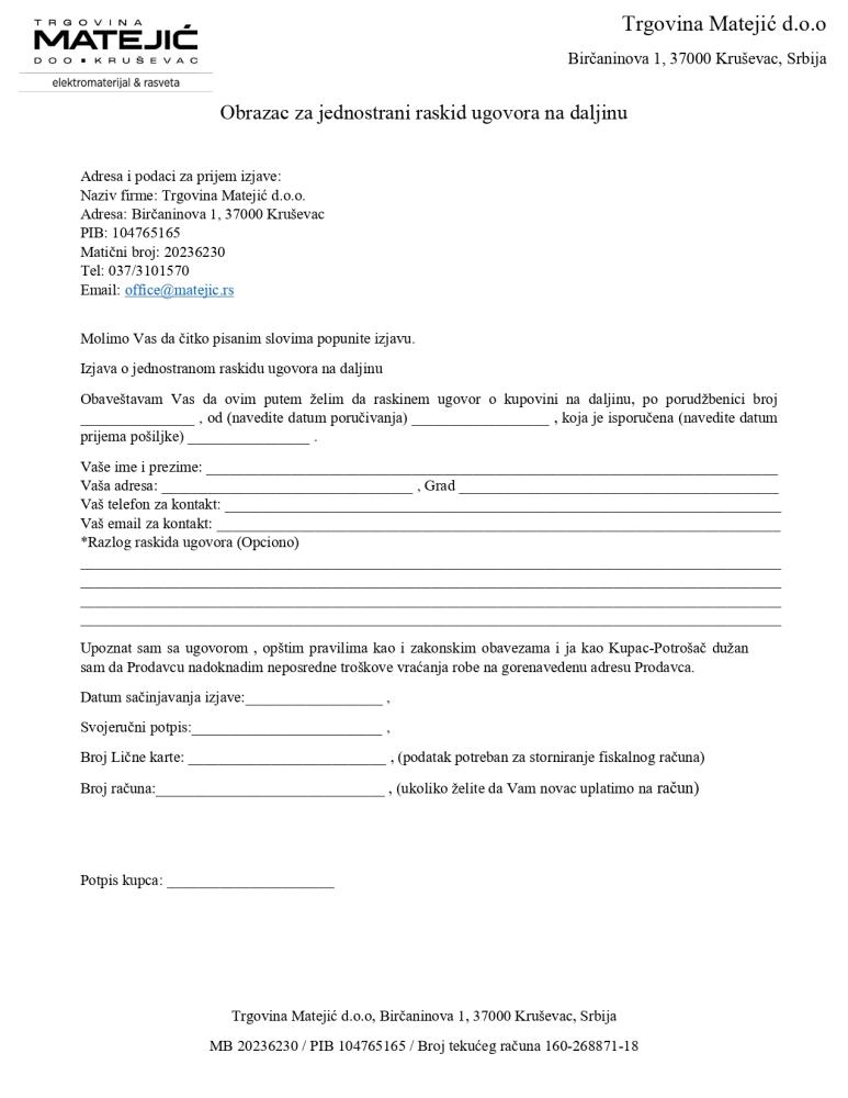 Kao Korisnik imate pravo na jednostrani raskid ugovora u skladu sa Zakonom o zaštiti potrošača. U slučaju odustanka od kupovine u roku od 14 (četrnaest) dana od dana prijema robe, potrebno je da popunite Obrazac za raskid ugovora i da zajedno sa Zahtevom za povraćaj novca pošaljete na reklamacije@elektrika.rs sa naznakom "Raskid ugovora". Vraćanje poručenih proizvoda na adresu dogovorenu sa Trgovinom Matejić d.o.o. dužni ste da vršite o svom trošku što je moguće pre, a najkasnije u roku od 14 (četrnaest) dana od dana slanja Obrasca o odustanku. Moguće je vratiti samo proizvode koji su neoštećeni i nekorišćeni.